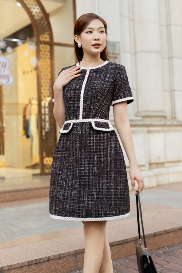 Thiết kế đầm kiểu dáng vest thanh lịch, phong cách, chít eo tôn dáng, viền trắng thắt bím tạo điểm nhấn.