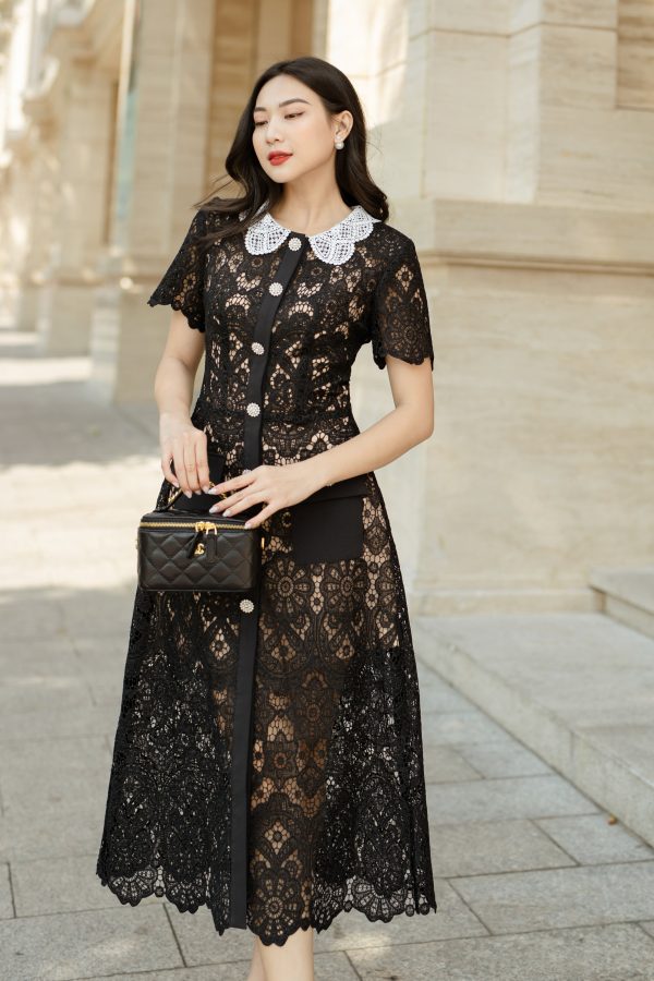 Thiết kế đầm ren tạo nên vẻ huyền bí, ấn tượng và quyến rũ, nhưng không kém phần thanh lịch với dáng cổ bèo, nhẹ nhàng, màu trắng tạo điểm nhấn.