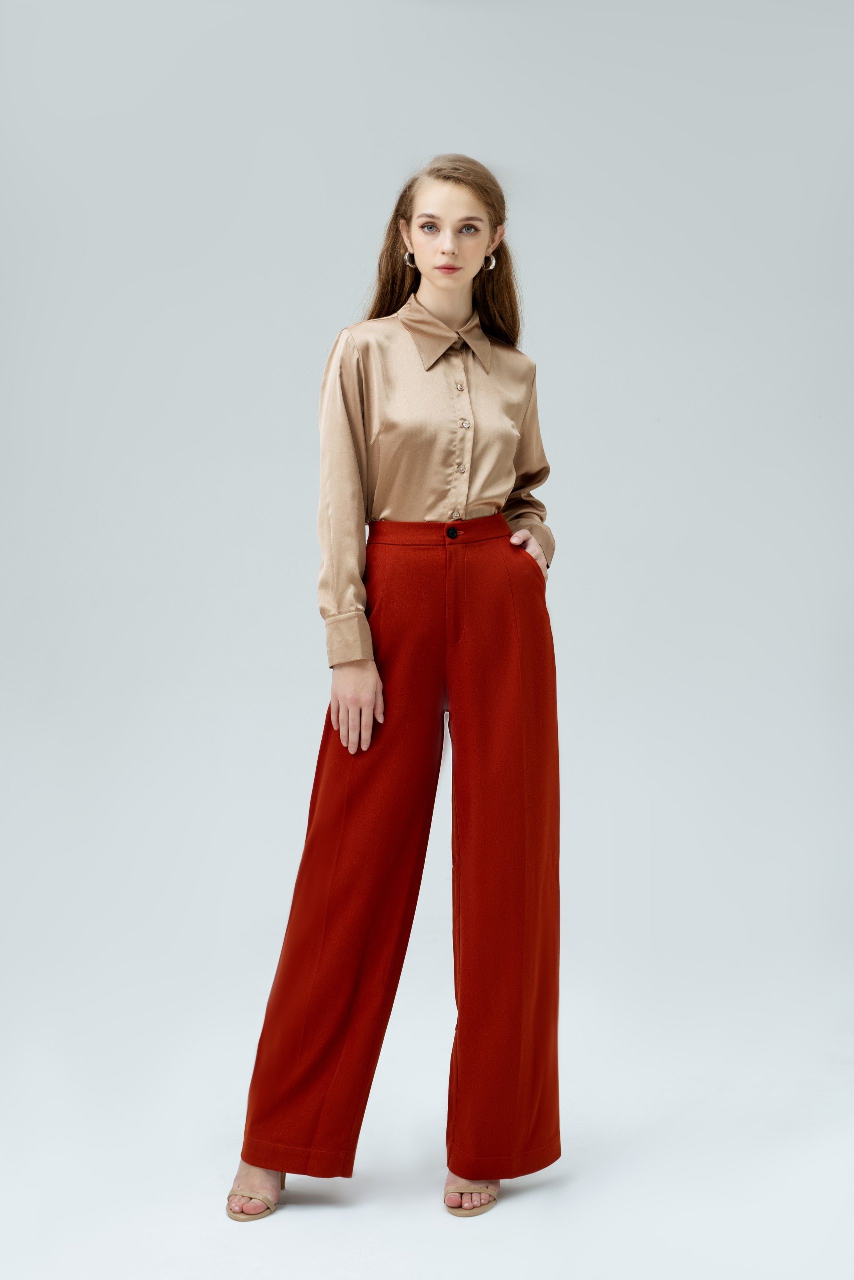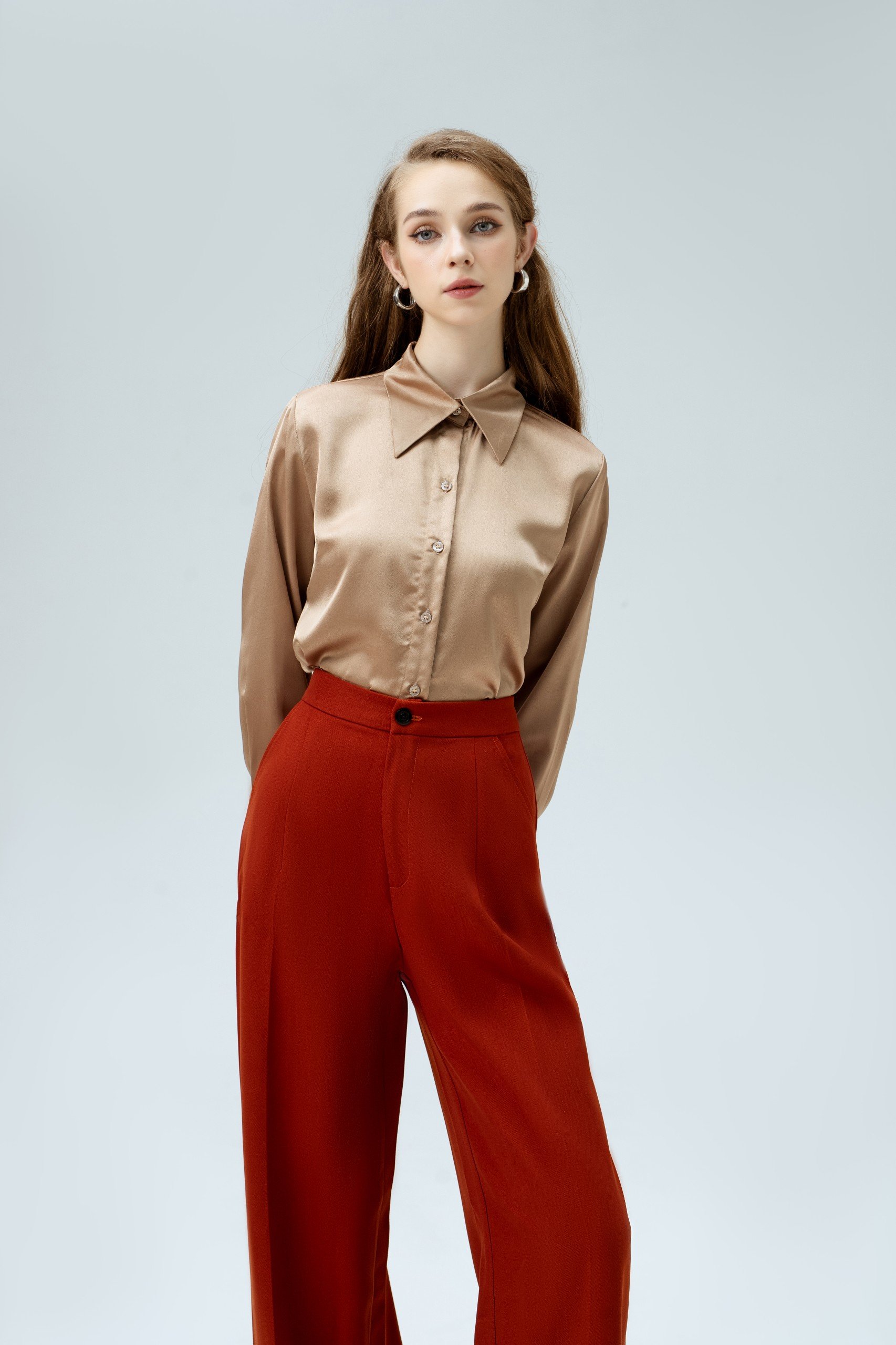 Chiếc áo sơ mi lụa màu đỏ là sự kết hợp hoàn hảo giữa vẻ đẹp truyền thống và sự sang trọng hiện đại.