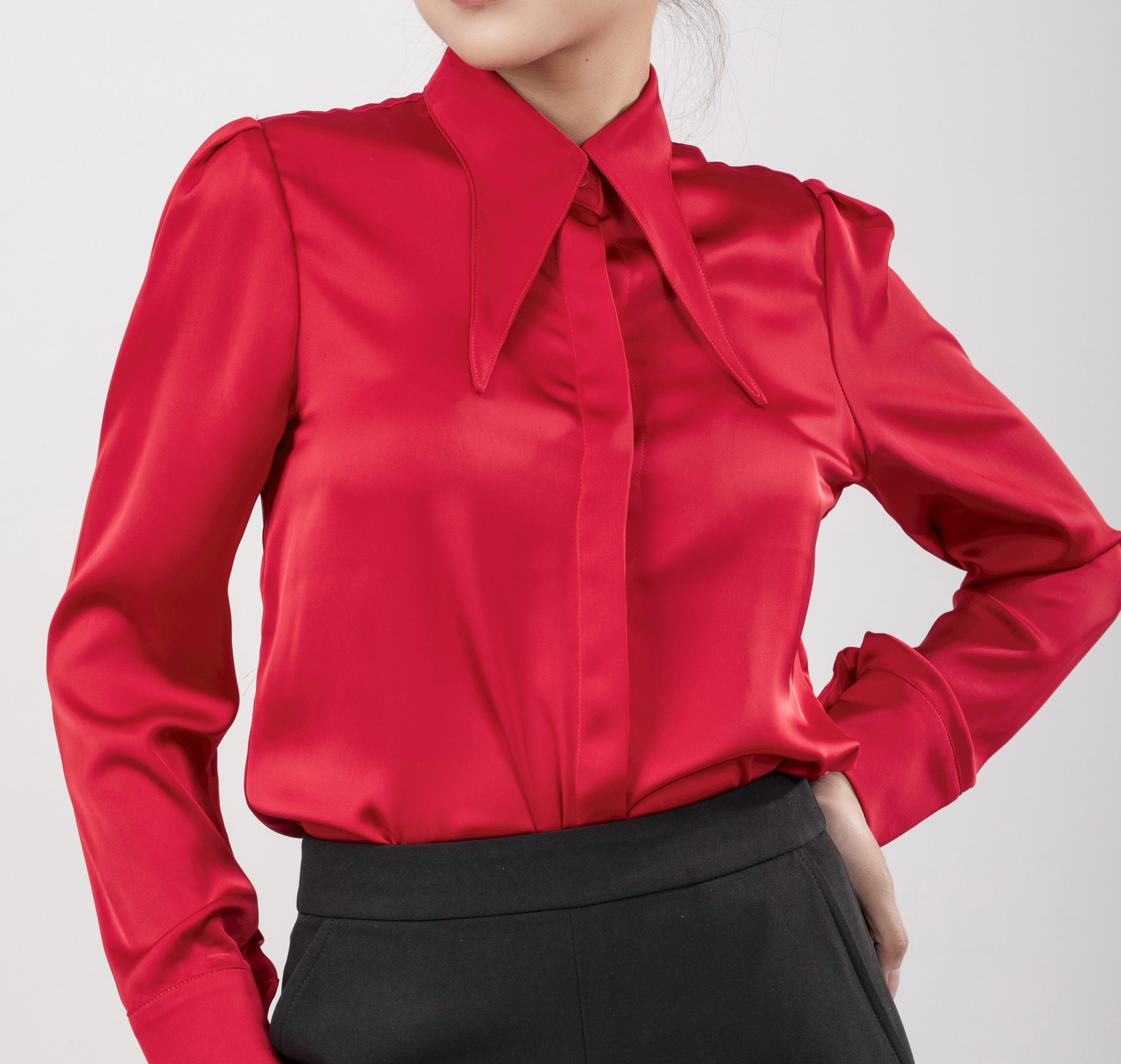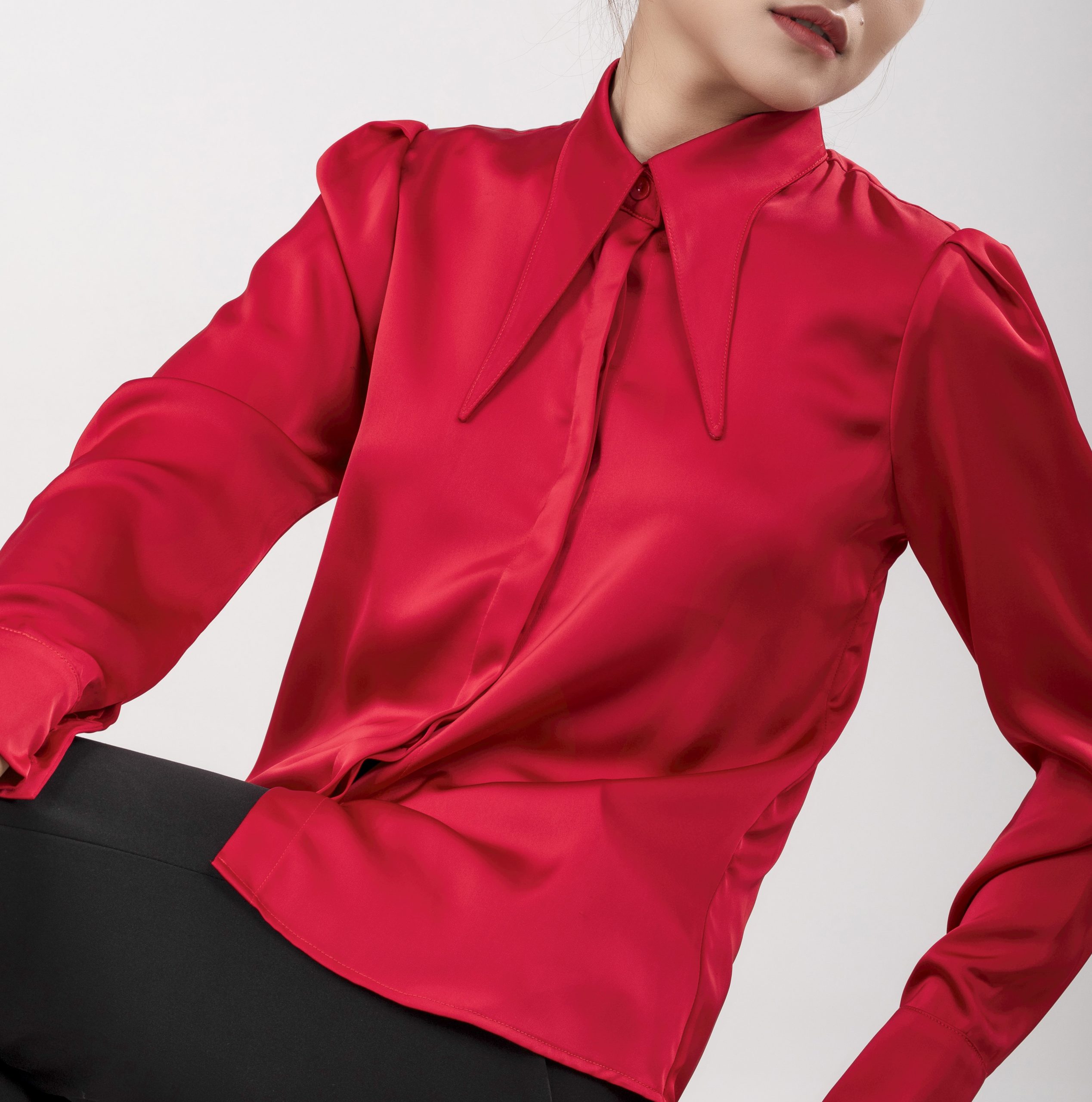 Chiếc áo sơ mi lụa màu đỏ là sự kết hợp hoàn hảo giữa vẻ đẹp truyền thống và sự sang trọng hiện đại.