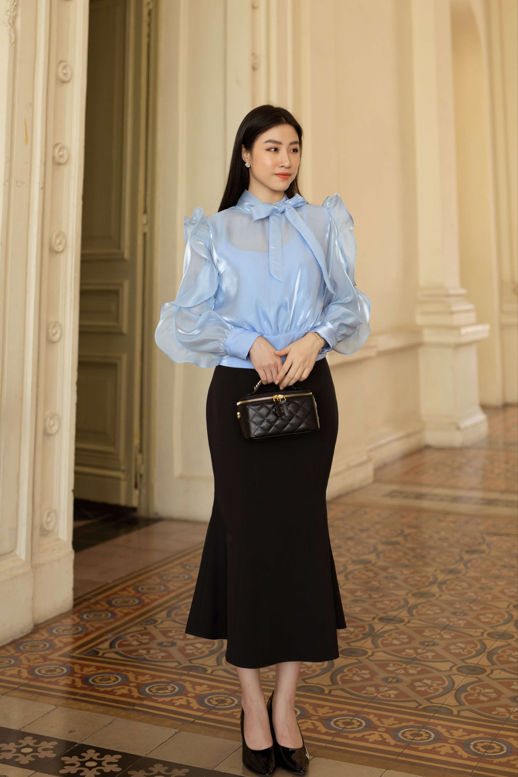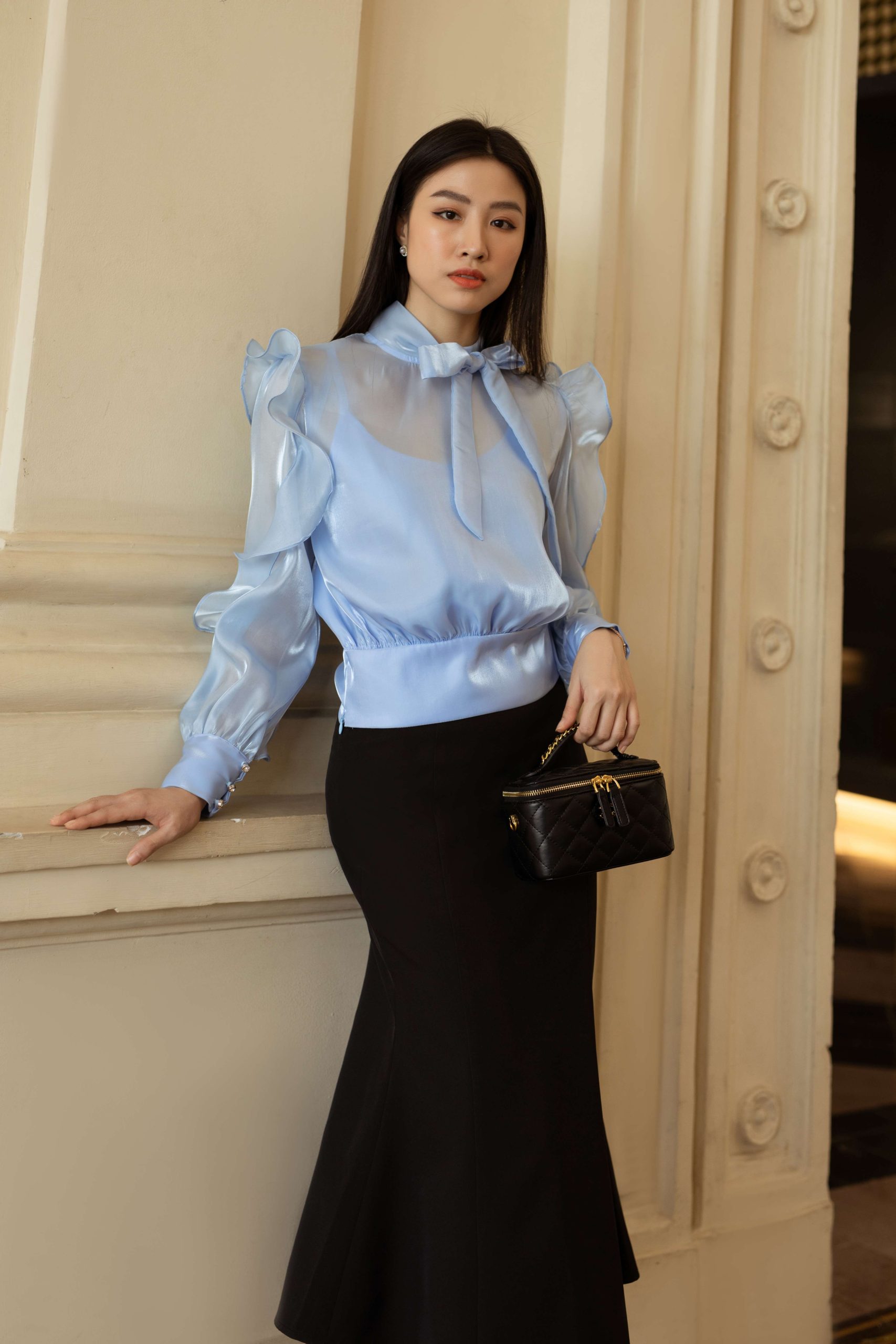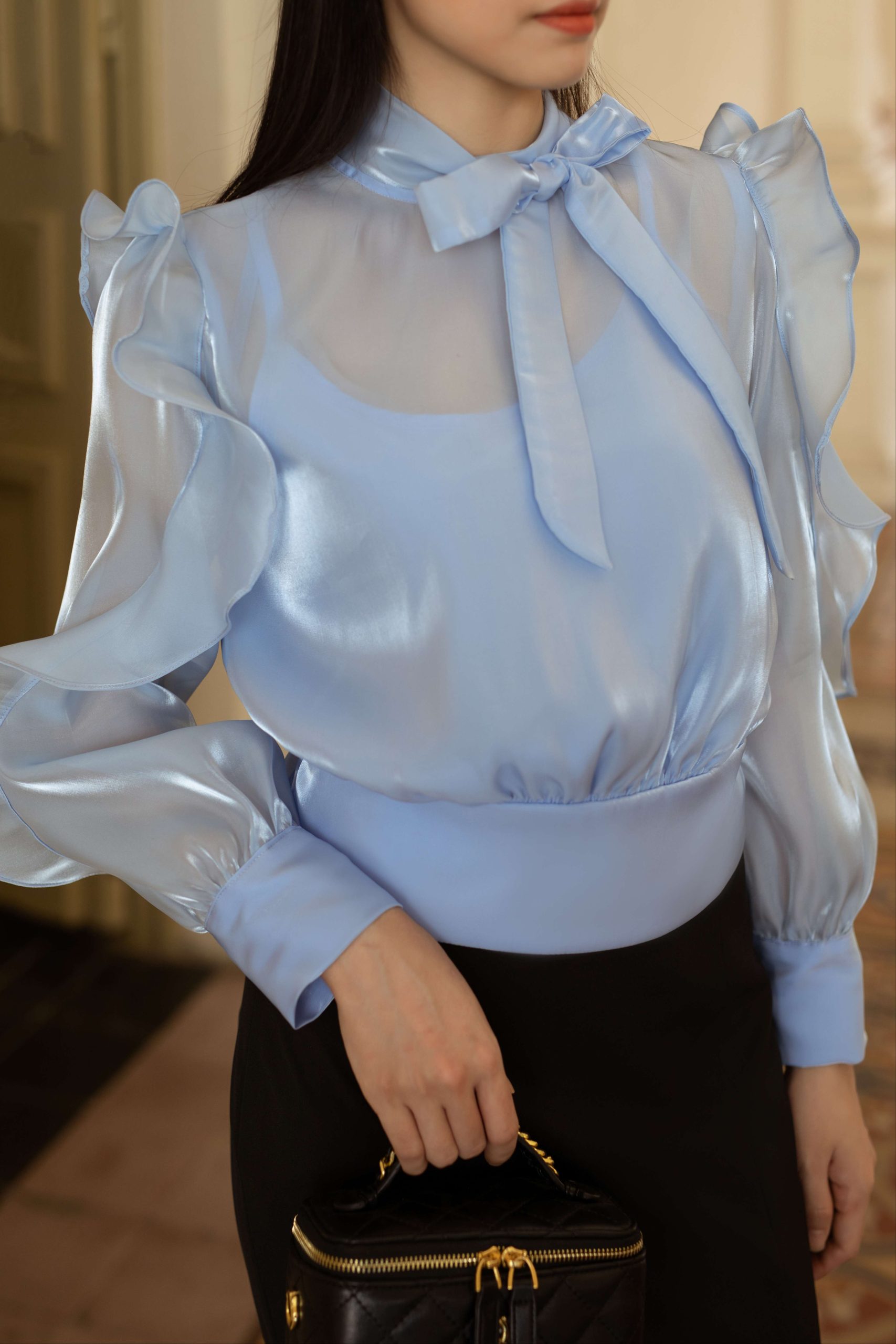 Chiếc áo voan phối hợp cổ nơ và tay cánh tiên. Thiết kế mang lại sự trẻ trung và đầy thanh lịch.
