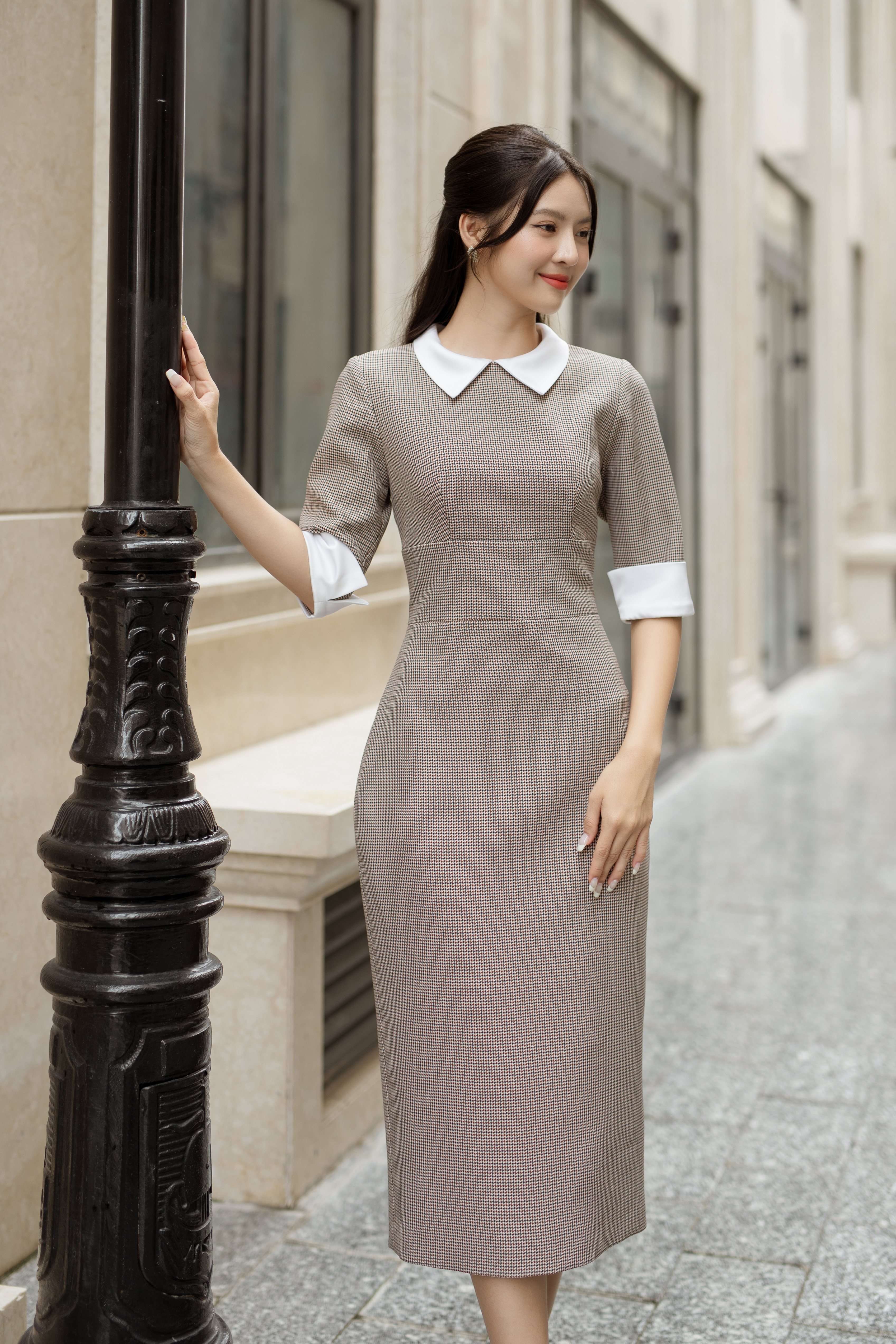 Chiếc đầm công sở được thiết kế với phần tay lở làm tăng phần lịch sự và chuyên nghiệp.