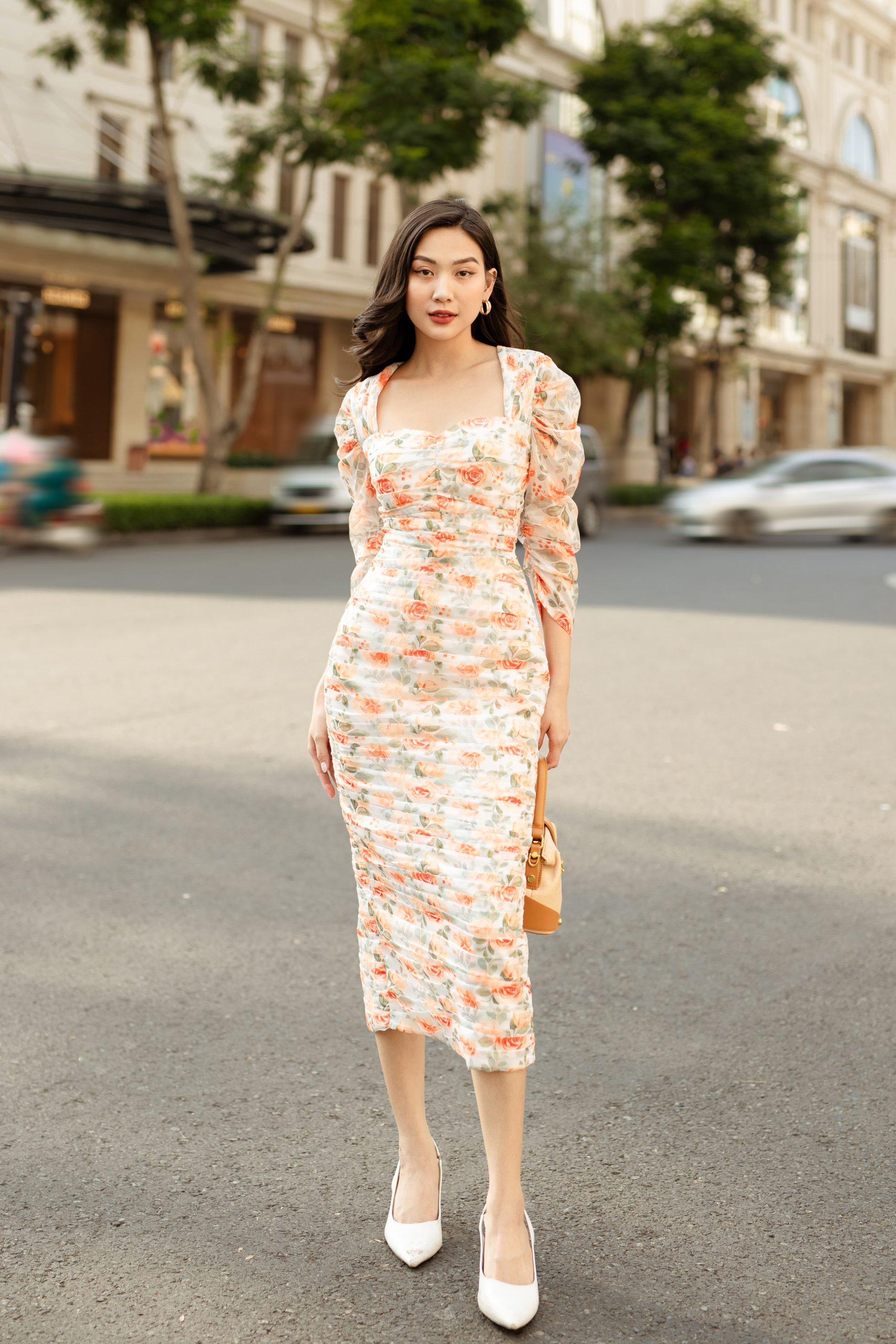 Thiết kế đầm voan dáng dài ôm body, sang trọng, nhẹ nhàng, trẻ trung, tươi tắn với họa tiết hoa màu cam.