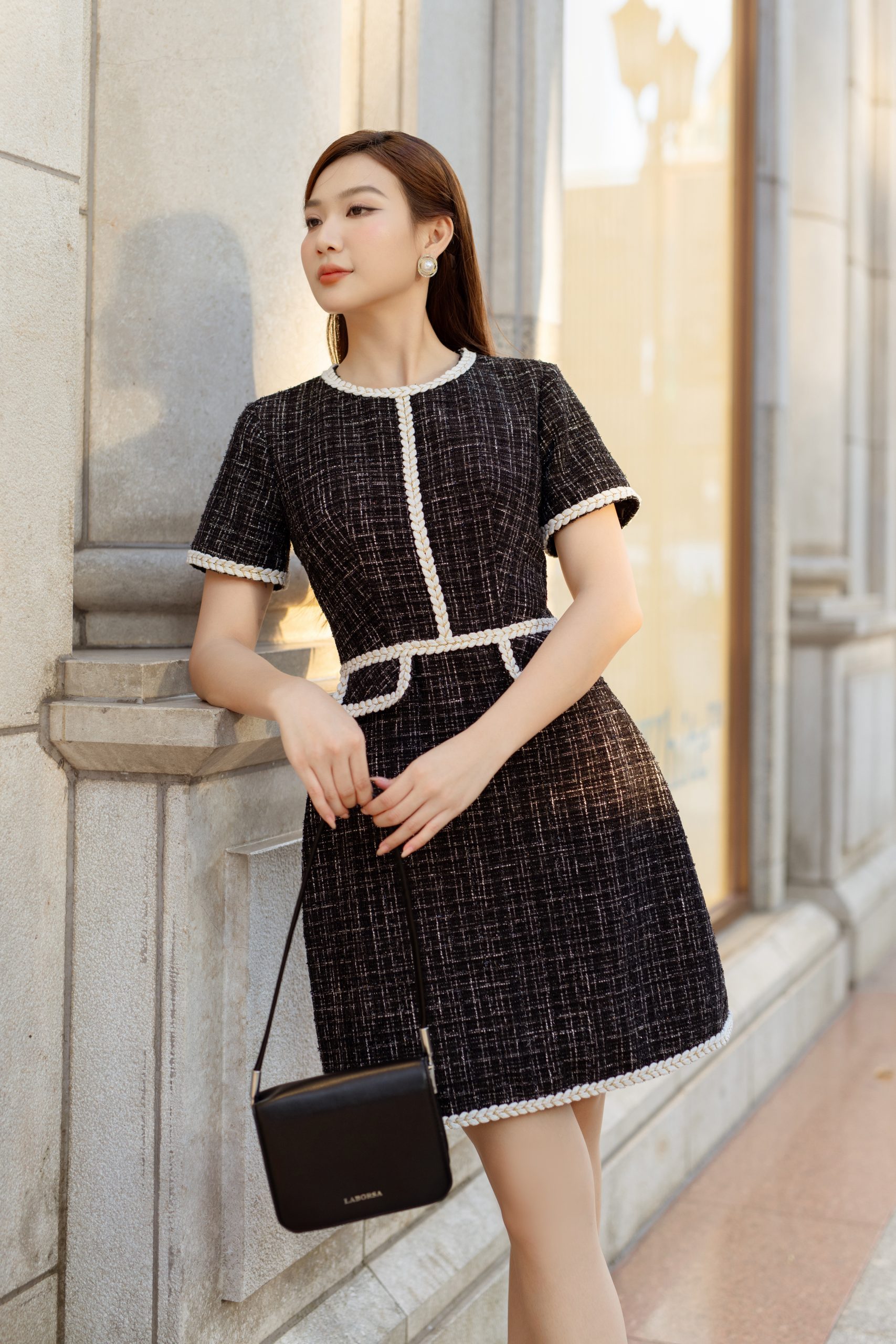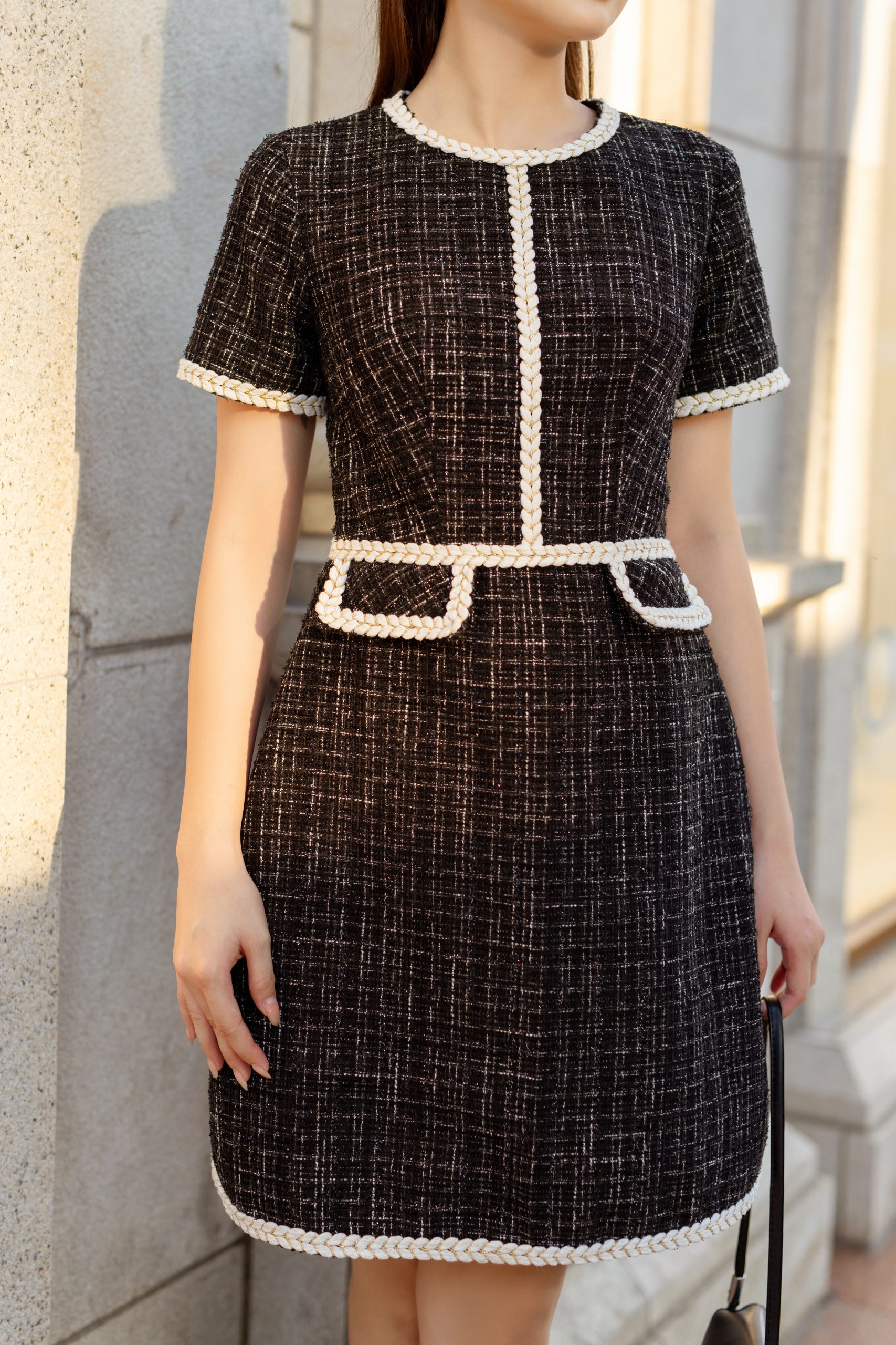Thiết kế đầm kiểu dáng vest thanh lịch, phong cách, chít eo tôn dáng, viền trắng thắt bím tạo điểm nhấn.